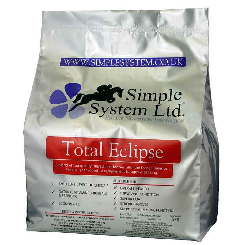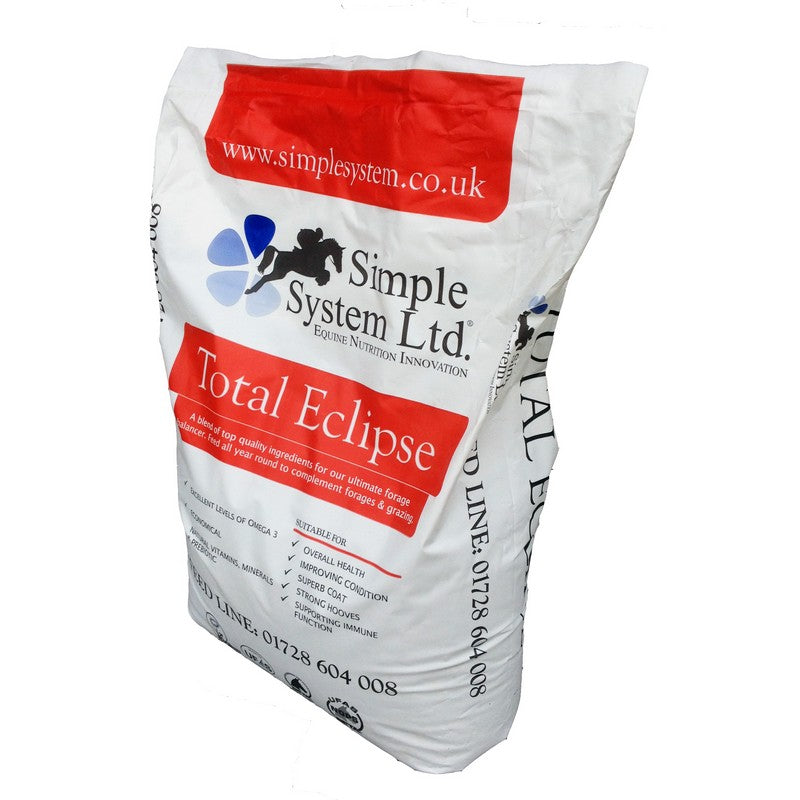 Simple System Total Eclipse is a blend of high quality ingredients to create a superb forage balancer that can be fed all year round to complement forages and grazing. This is a highly economical feed that is high in vitamins, minerals and prebiotics to aid in nutrient absorption. Can be used to promote overall health, condition, coat, hooves and a strong immune function.